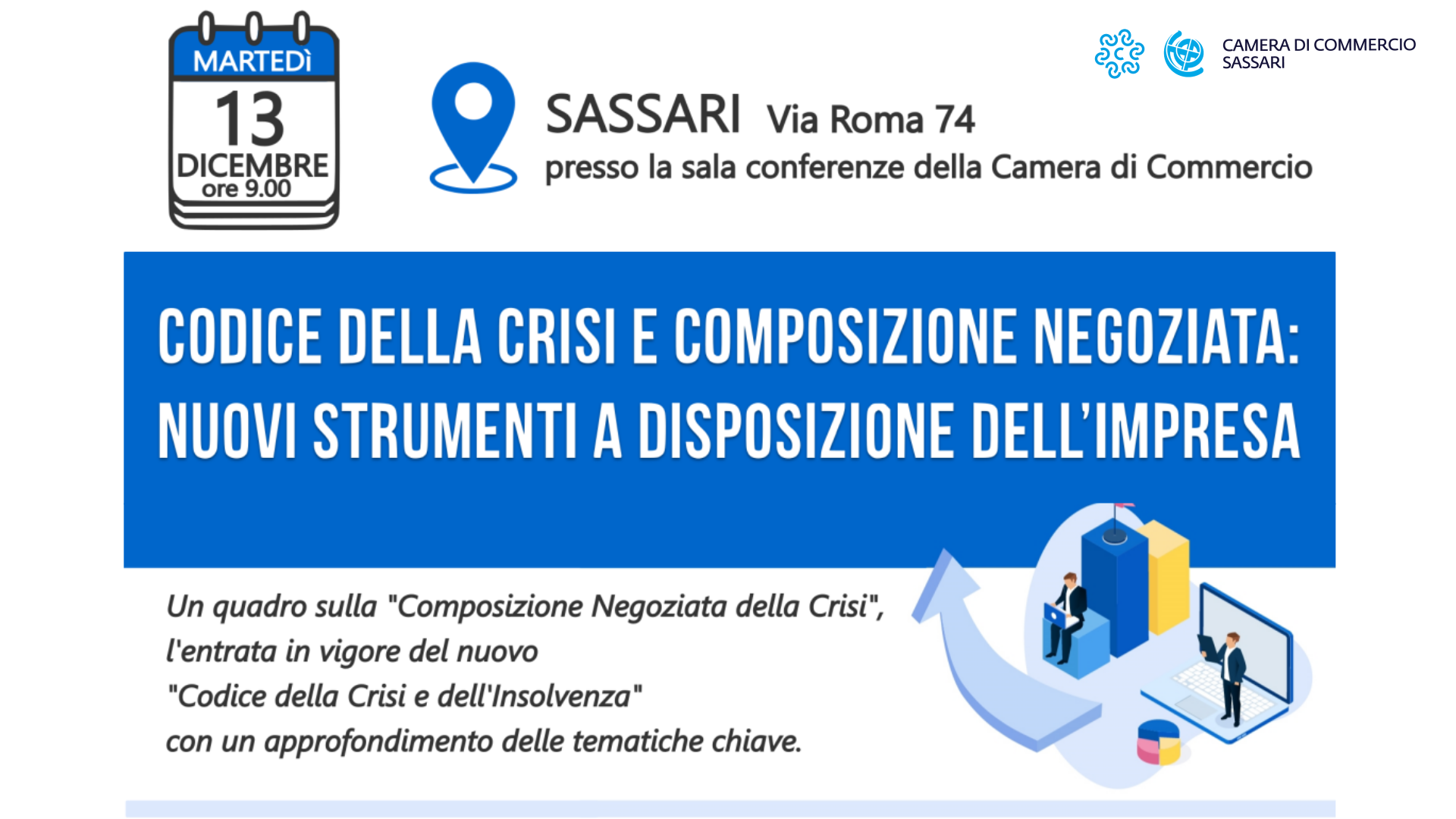 Si svolgerà a Sassari il prossimo 13 dicembre alle ore 9.00 presso la sala conferenze della sede camerale di via Roma 74, un convegno intitolato: "CODICE DELLA CRISI E COMPOSIZIONE NEGOZIATA, NUOVI STRUMENTI A DISPOSIZIONE DELL’IMPRESA".